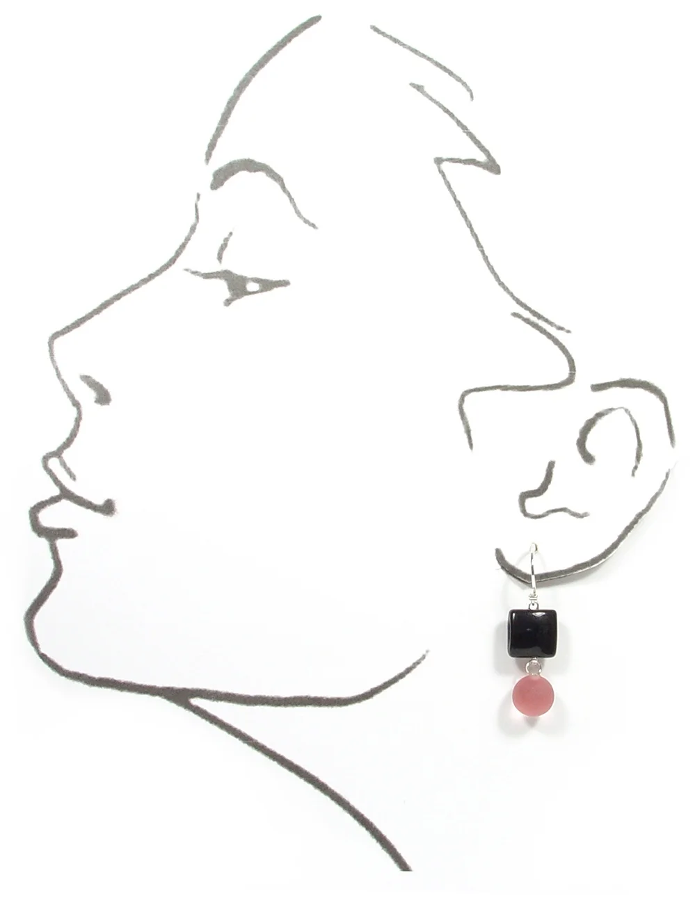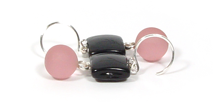 Etched droplets of richly hued pink under petite pillowed tiles of jet black contrast each other’s best qualities…. Easily wearable, nicely swingy with my sterling hinge system… delightful.