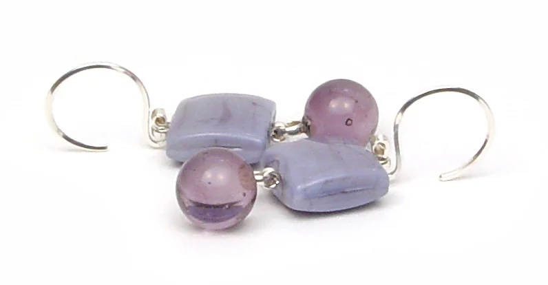 A tad is just enough… again small and delicate wins the race… petite pillowed tiles in a pale lilac, with a dangle of Glassdaddy purple veiled over clear for a watery wisteria. Nicely hinged - these are near weightless - but have a delightful presence, in form, movement, and color.