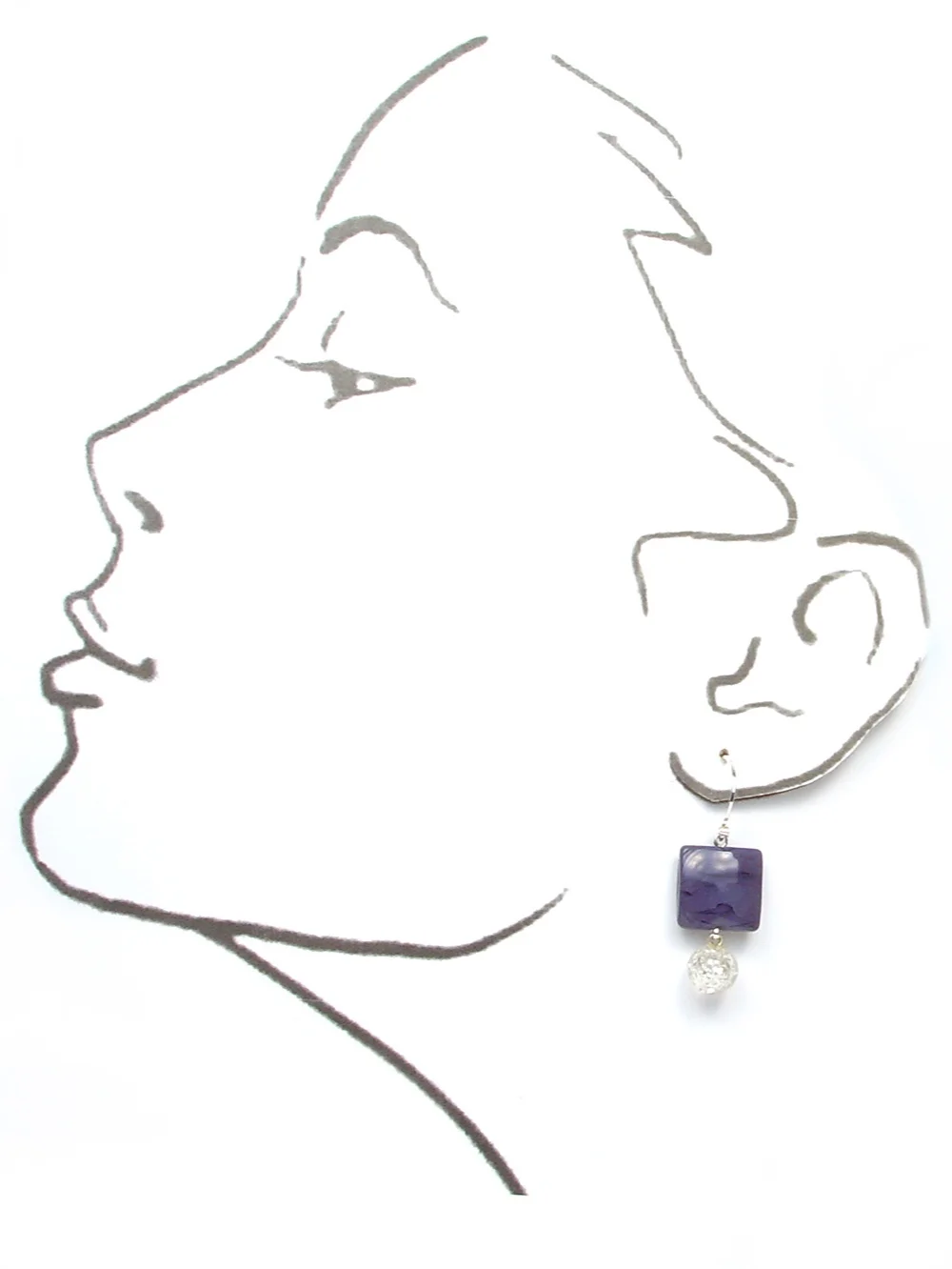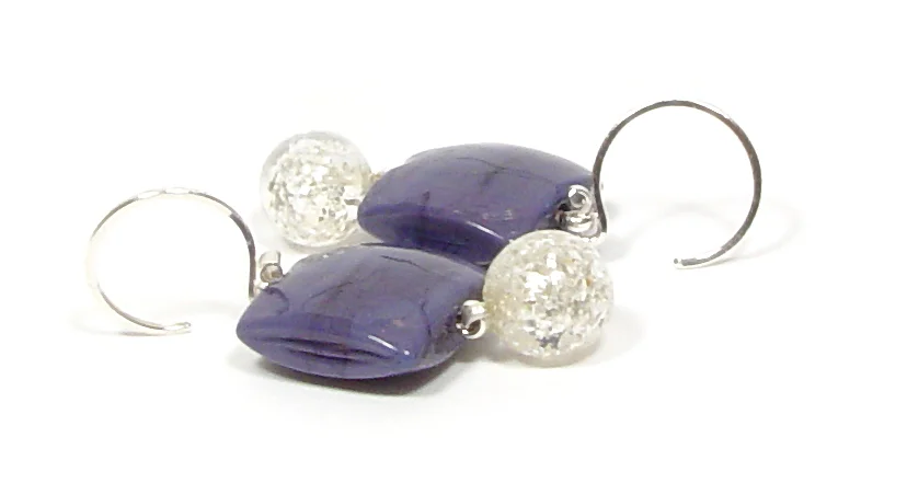 A little larger pillowed tile 15mm sq. with 3/8”dia glittering single hole dangles - clear with silvery mica that’s encased… so - attention popping purple, and shimmering silver that’s swinging below… how could these not add spring to ones step?