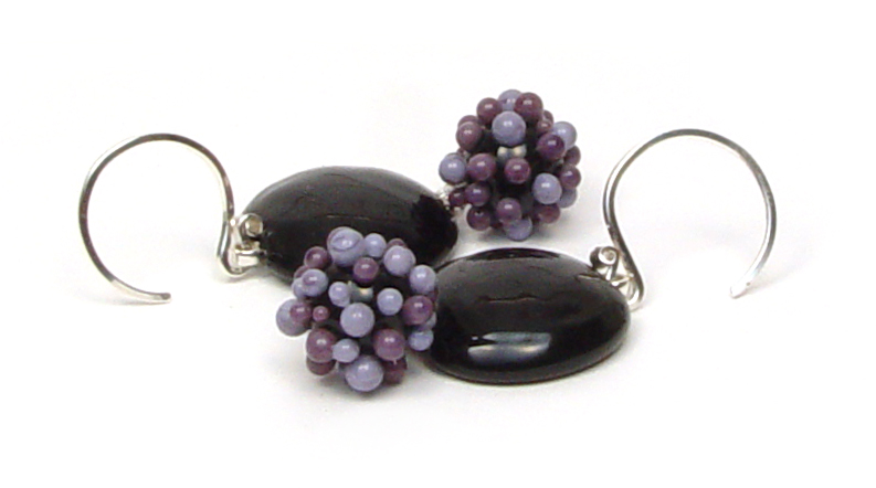 Purple in a few different shades with small punctuation of black.. dot the dangling single hole bead below the half lentil of the top bead. Nicely understated - these say it all - but with very few words.