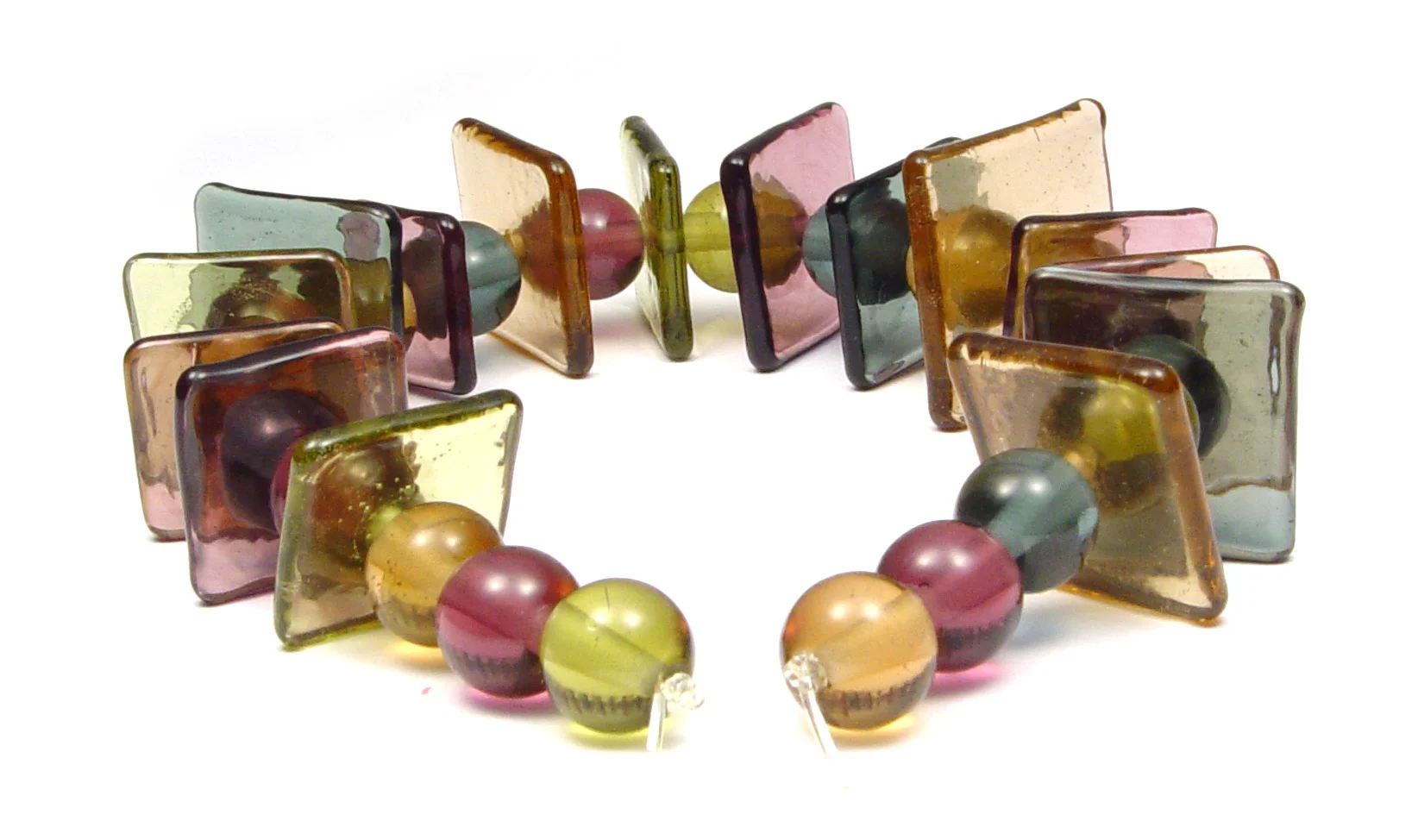 These thin beads allow light to pass and release color - the lighter colored tiles show a more densely colored edge. I find it's best to string with at least 3/8"D bead (as shown) in between to allow the light. IMHO